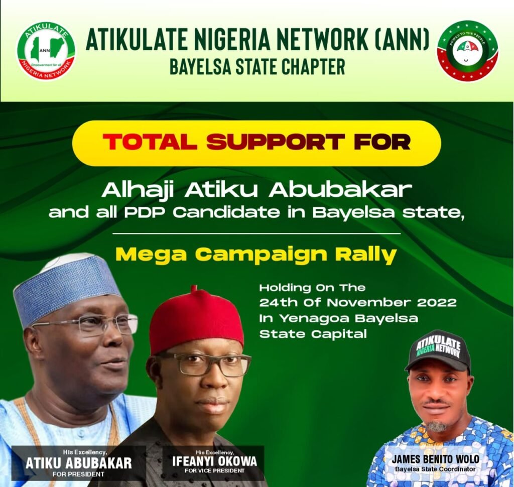 The Bayelsa State Chapter of Atikulate Nigeria Network says it has concluded plans to hold a political campaign rally in Yenagoa, Bayelsa state to galvanize support for the election of Alhaji Atiku Abubakar in the 2023 general elections as well as all the PDP candidate contesting for National and State Assembly elections.