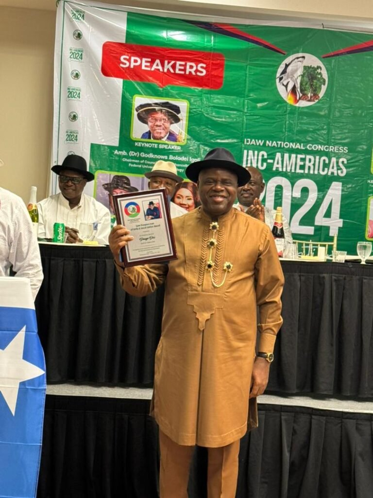 The three-day 2024 convention was organized by the Ijaw National Congress (INC)-Americas. Also recognized at the event were former Nigerian first lady, Dame Patience Jonathan, the Minister of State for Petroleum (Oil), Senator Heineken Lokpobiri, as well as renowned author and Ibenanaowei of Ekpetiama kingdom, King Bubaraye Dakolo.