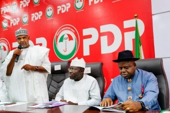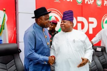 L-R: Acting National Chairman, Peoples Democratic Party, Umar Damagum, Deputy National Chairman (South) and Bayelsa State Governor and PDP governorship candidate, Senator Douye Diri, during the inauguration of the party’s national campaigns council for Bayelsa, Imo and Kogi governorship election at the PDP National Secretariat, Wadata Plaza, Abuja, on Wednesday.