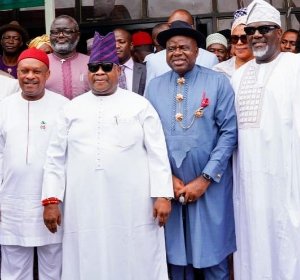 L-R: Peoples Democratic Party governorship candidate in Imo State, Senator Samuel Anyanwu, Osun State Governor, Senator Ademola Adeleke, Bayelsa State Governor and PDP candidate, Senator Douye Diri and governorship candidate in Kogi State, Senator Dino Melaye during the inauguration of the party’s national campaigns council for Bayelsa, Imo and Kogi governorship election at the PDP National Secretariat, Wadata Plaza, Abuja, on Wednesday