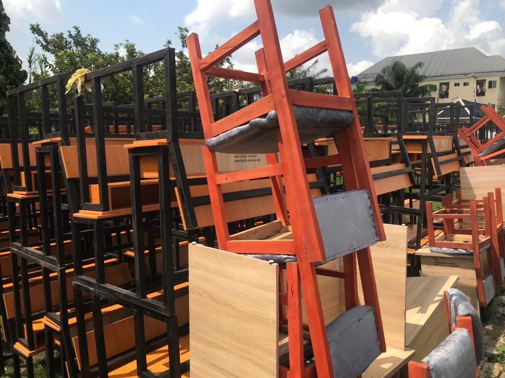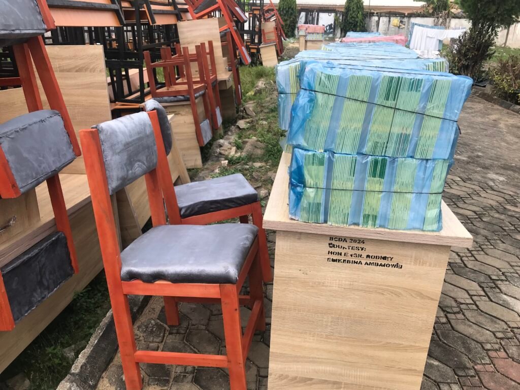 In a historic ceremony in Amassoma on Tuesday, 26th November 2024, a total of 273 HDF pupils’ desks, 30 HDF teachers’ tables, 30 HDF teachers’ chairs, and 16,800 copies of customized not-for-sale notebooks of 20, 40, 60, and 80 leaves, respectively, were handed over to the principals of Government Secondary School (GSS), Amassoma; Southern Ijaw Secondary School (SISSO), Oporoma; Community Secondary School (CSS), Otuan; Community Secondary School (CSS), Eniwari; Ogboin Grammar School (OGS), Amatolo; and St. Stephen Primary School, Amassoma.