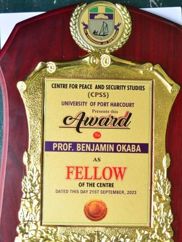 Founder of the Center for Peace and Security Studies, Prof Mark Anikpo presenting the Fellow award to the erudite professor Benjamin Okaba, said the award will propel their inner mind to advocate for peace in the country.
