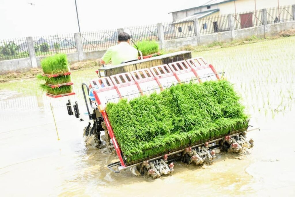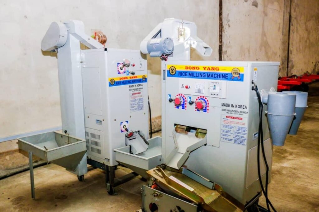 The items include four tractors, two rice transplanting machines, one rice seeding machine, 10,000 rice seed beds, and four 10-tonne per day rice mills.