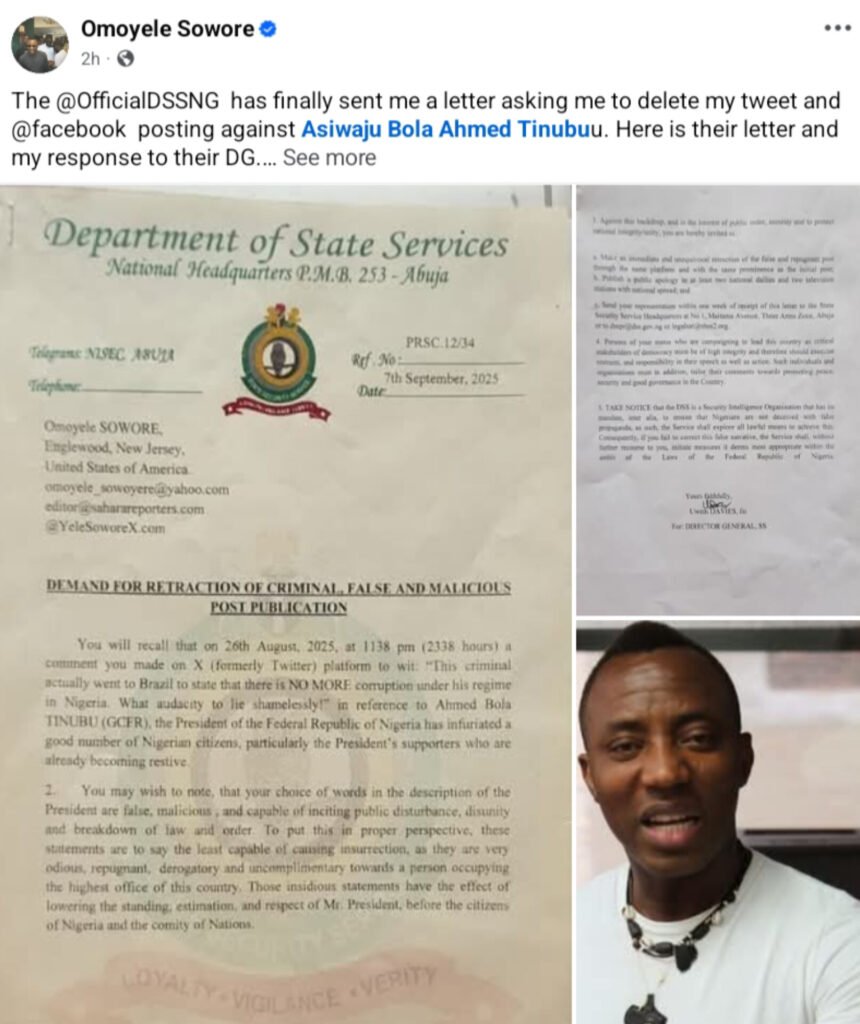 Thank you for reading this post, don't forget to subscribe!Former presidential candidate and publisher of Sahara Reporters, Omoyele Sowore, has fired back at the Department of State Services (DSS) after the agency issued him a letter demanding the deletion of his social media posts critical of President Bola Ahmed Tinubu.